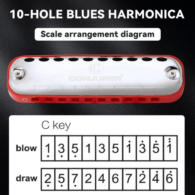 - CONJURER blues harmonica in C (model:WH1007) is basic harmonica for beginners. It is specifically developed for young children, it has arc-shaped corners instead of sharp edges and corners, making it safe for kids to use. It is a diatonic 10-hole harmonica with 20 tones that may be played by adults, kids, and novices. Blues, folk, rock, country, jazz, and other genres may all be played on a blues 10 hole harmonica.