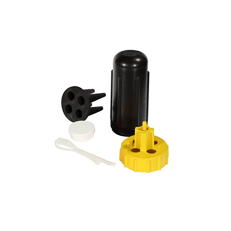 - 1 plastic box with thread, 130 x 65 mm, colour: black, 1 insertion spout 4-way 5-14 mm, colour: black, 1 plastic lid with thread, diameter 65 mm, yellow