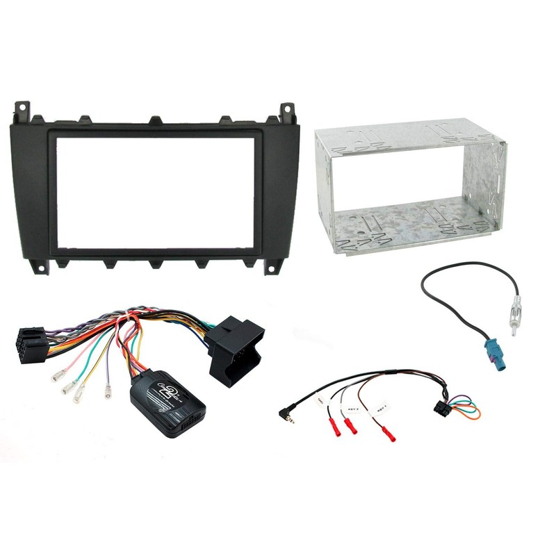 - Mercedes C Class W203 Installation Kit; Supplied with Black Double Din Fascia, Can-Bus Steering Wheel Control Interface, Fakra Antenna Adapter and Universal Patchlead