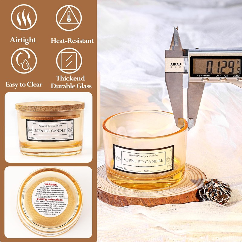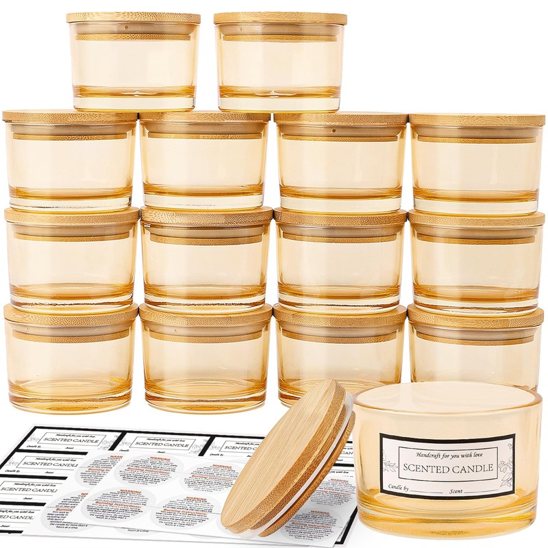 - Value Candle Making Supplies Pack: 15 Pcs wide mouth 4oz empty amber/ Champagne candle jars with bamboo lids, 16 Scented Candle sticker labels and 16 candle warning labels. Suitable for fall Decor, DIY homemade candle starters and candle making business.
