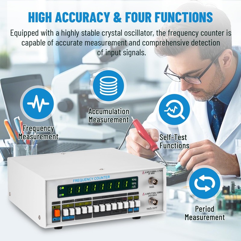 - High Accuracy & Four Functions: Equipped with a highly stable crystal oscillator, this frequency counter is capable of accurate measurement and comprehensive detection of input signals. It also has frequency measurement, period measurement, accumulation measurement and self-test functions, which can meet your various measurement needs.