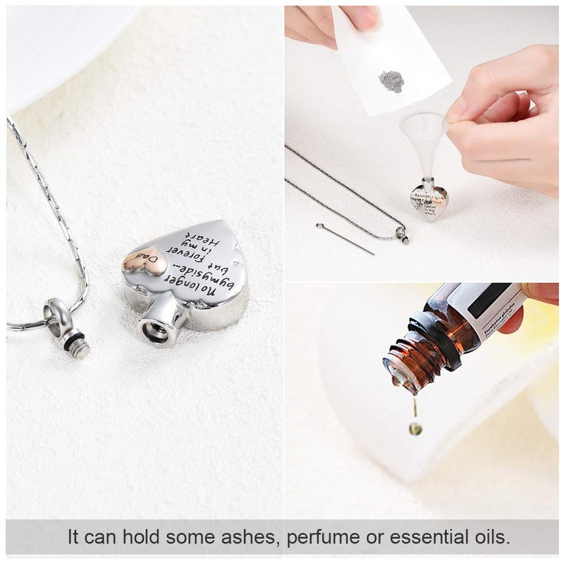 - ❤【Cremation Jewelry for Ashes】-- Loosen the screws and use a funnel tool to pour the ashes into the heart pendant. It can also hold small amounts of dried flowers, perfumes, essential oils, special messages, a bunch of hair, clay or sand.