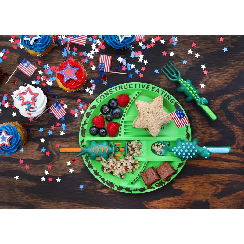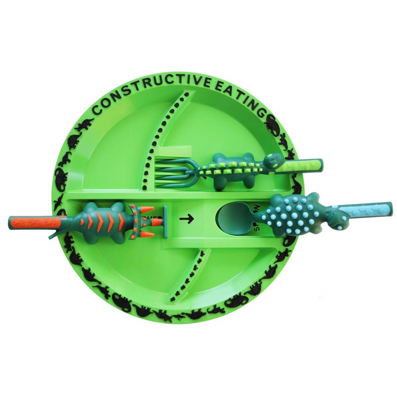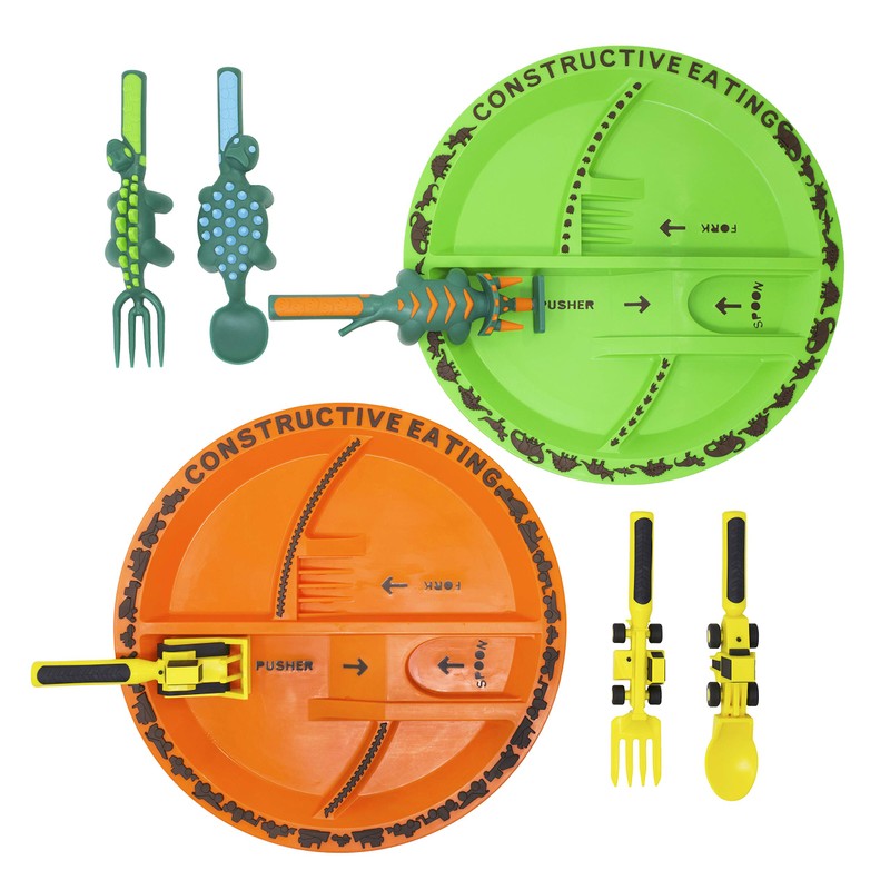Build healthy eating habits with the perfect combo for any child: Constructive Eating's award winning Dino Plate with Set of Dino Utensils and Construction Plate with Set of Construction Utensils. These new and exciting products keep kids engaged during mealtime and encourage independence and imagination. Use the pushers to push food up the plate's ramp and watch it drop into the spoon. Park the forks in the backstop on the plate to corner those tricky peas. Both plates are microwave safe and all of the plates and utensils are dishwasher safe for easy clean up. This set makes the perfect gift for any young dinosaur or construction fan!