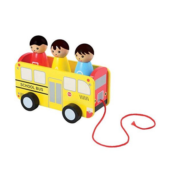 Constructive Playthings 7.8" x 4" x 6" Wooden Pull Along School Bus with 3 Shape Matching Riders for Ages 2 Years and Up