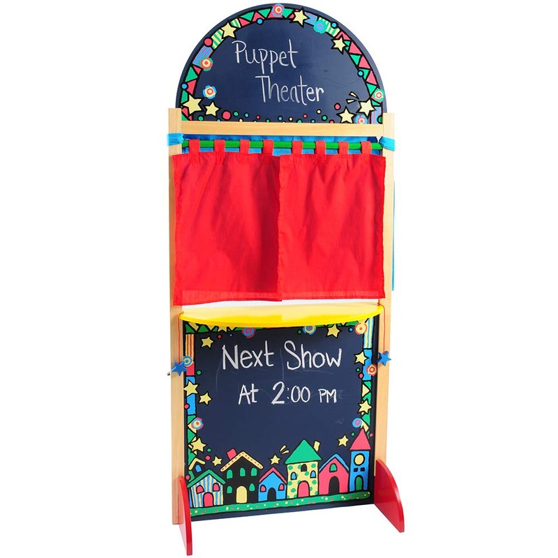 Constructive Playthings Kid-Sized Hardwood Puppet Theater, Includes Chalkboard, Curtain and Backdrop, Durable Constructive, Perform with Toddler Toys or Puppets, All Ages
