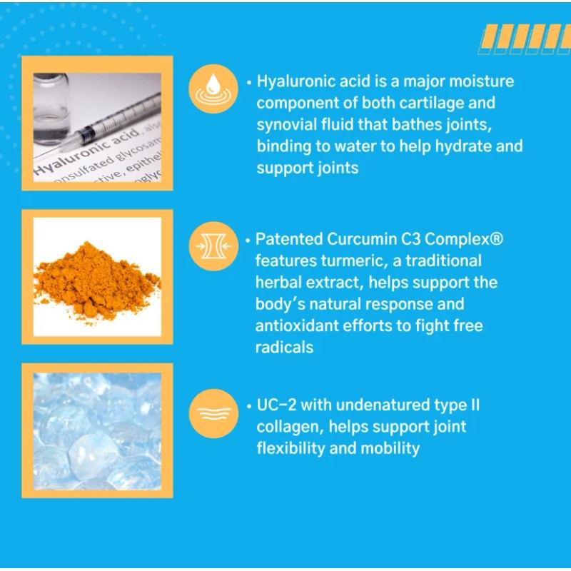 - Active Ingredients: Calcium, Collagen Type II, Curcumin, Hyaluronic Acid, Turmeric