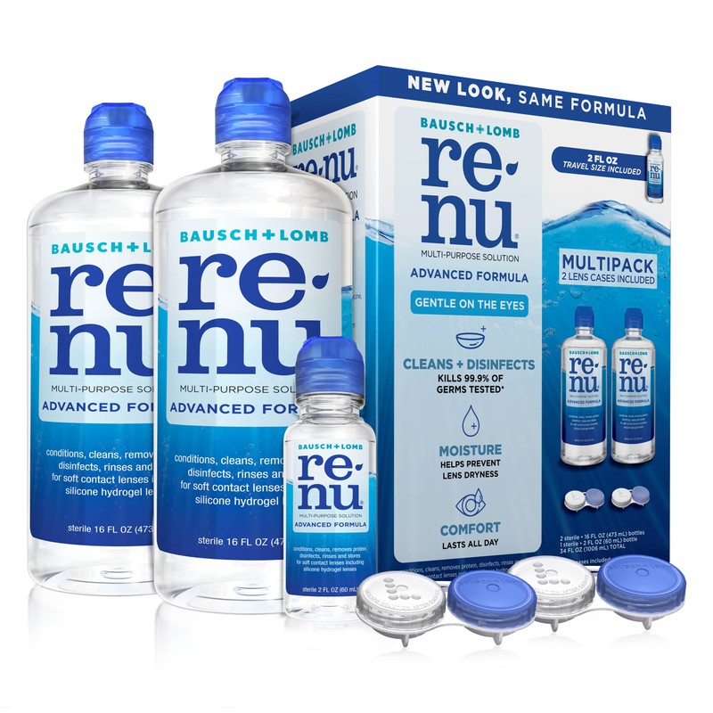 renu Contact Lens Solution, Multi-Purpose Disinfectant, Advanced Formula Kills 99.9% of Germs, 16 Fl Oz (Pack of 2), Includes 2 Fl Oz Travel Size