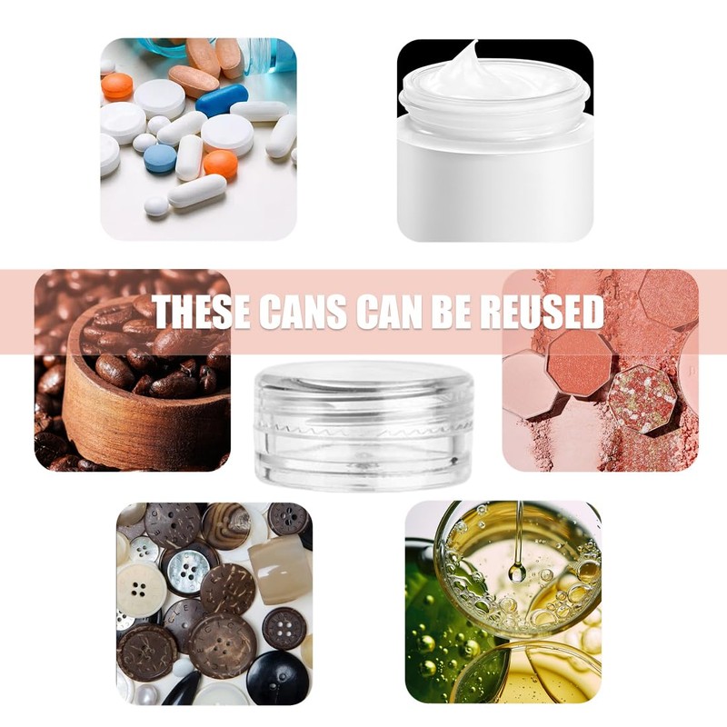 - Widely used: transparent plastic jars are perfect for filling cosmetics such as lip balm, face cream, foundation, lotion, eye shadow, fragrance, small nail art decorations, rhinestones, glitter powder and more. Perfect for use at home or on the go.