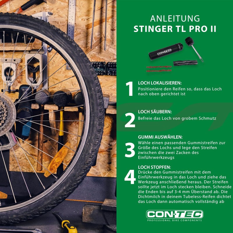 Discover the ultimate repair kit for your cycling adventure: the Stinger TL Pro II from CONTEC is the essential repair tool that will never let you down. Whether on a brisk lap with the road bike or on an extended tour with the e-bike – a flat tyre can quickly become a challenge. With this complete repair kit for tubeless tyres, you are always well prepared.