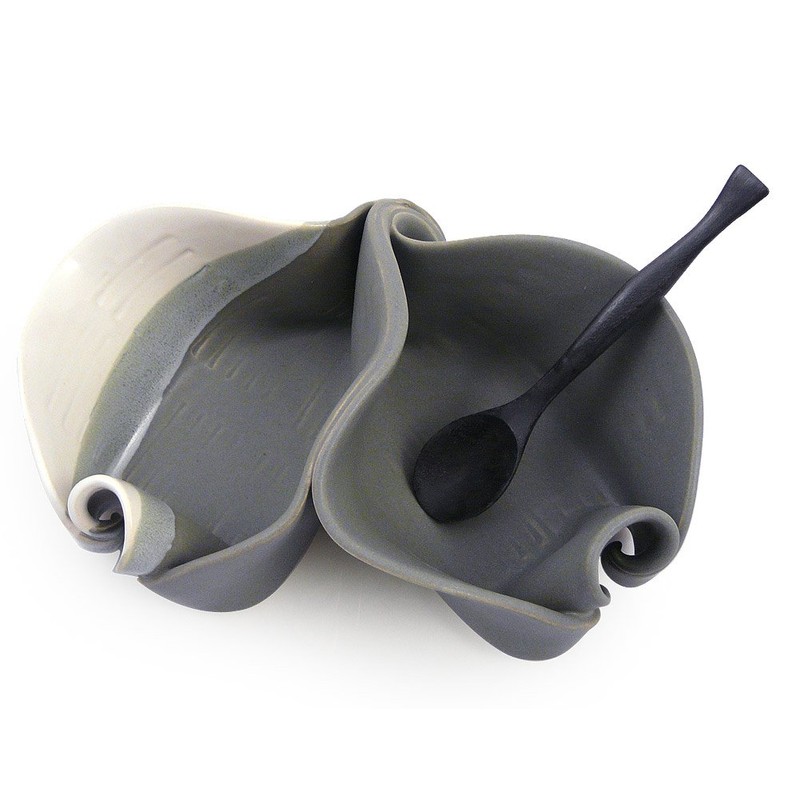 Contemporary Twist Double Server Dish with Rosewood Spoon, Handmade Stoneware Pottery, Grey/White