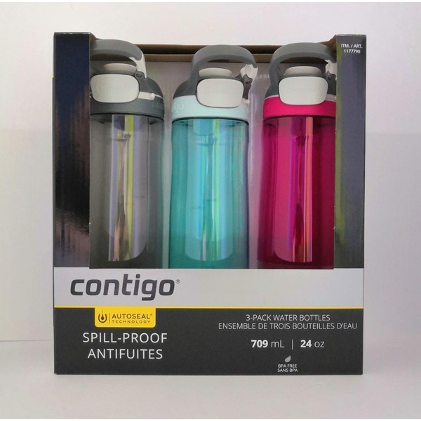 Contigo Autoseal Spill-Proof Water Bottle 24oz, 3 Pack (Smoke, Iced Aqua, Sangria)