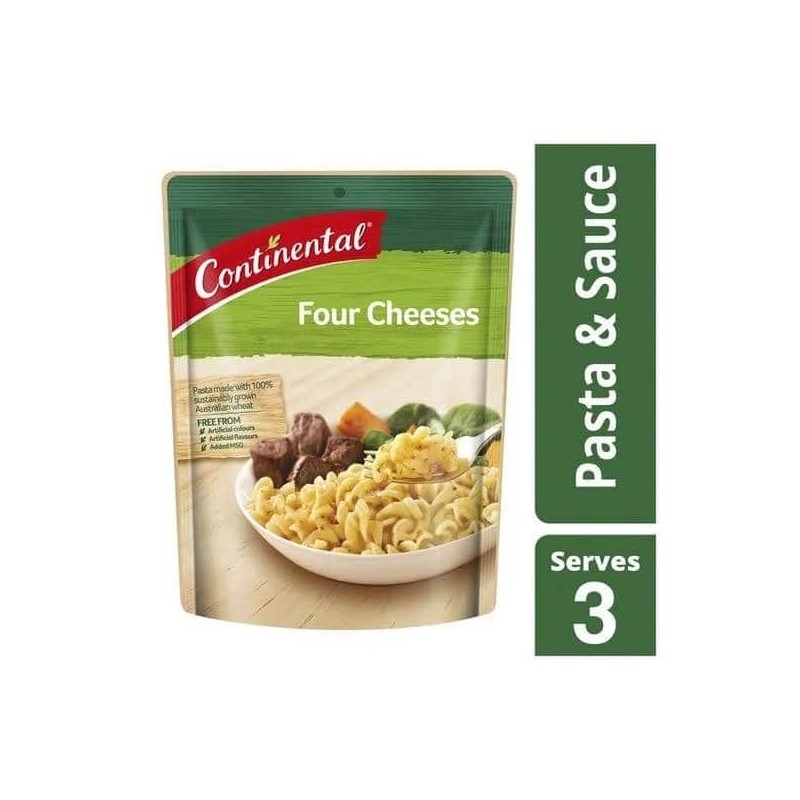 This Four Cheeses Pasta & Sauce is the ultimate cheese lovers delight! A deliciously creamy and cheesy pasta dish that everyone will love. Perfect on its own or serve with some crunchy chicken and a freshly tossed salad. How to Prepare: Cooking time: 10 minutes Stove top – for best results 1) Bring 1½ cups (375mL) Lite milk, 1 cup (250mL) hot water, 2 teaspoons Flora Salt Reduced spread and Pasta & Sauce pack contents to the boil, stirring 2) Simmer, uncovered for 10 minutes, stirring regularly until sauce thickens and pasta is cooked Microwave (900W) – cooking times may vary 1) Combine 1½ cups (375mL) Lite milk, 1 cup (250mL) hot water, 2 teaspoons Flora Salt Reduced spread and Pasta & Sauce pack contents in a microwave safe bowl 2) Cook uncovered on HIGH for 10-12 minutes. Stirring 2-3 times. Stand 2 minutes before serving. Cook a complete meal in 15 minutes. At Continental, we love food the way you do. We know how much you value good, nutritious, flavourful food, as well as authentic home cooking. It feels good to cook, and even better to bring pleasure to the ones you love, through the food you put on the table. For over 50 years now, our chefs at Continental have combined their expertise, love of flavour, and only the finest ingredients to help you create great tasting meals every day.