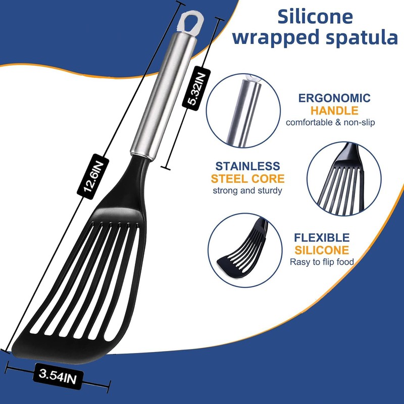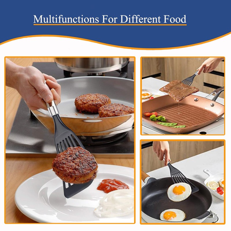- 🔥THIN Edge: The thin edge(0.004"thickness)but nylon blade does the turner job perfectly! Perfect for flipping longer foods like omelettes and fish filets slotted turner,easy to filter the oil out when frying foods.Size: 12.6*3.54,Weight: 3oz;All measurements are approximate.