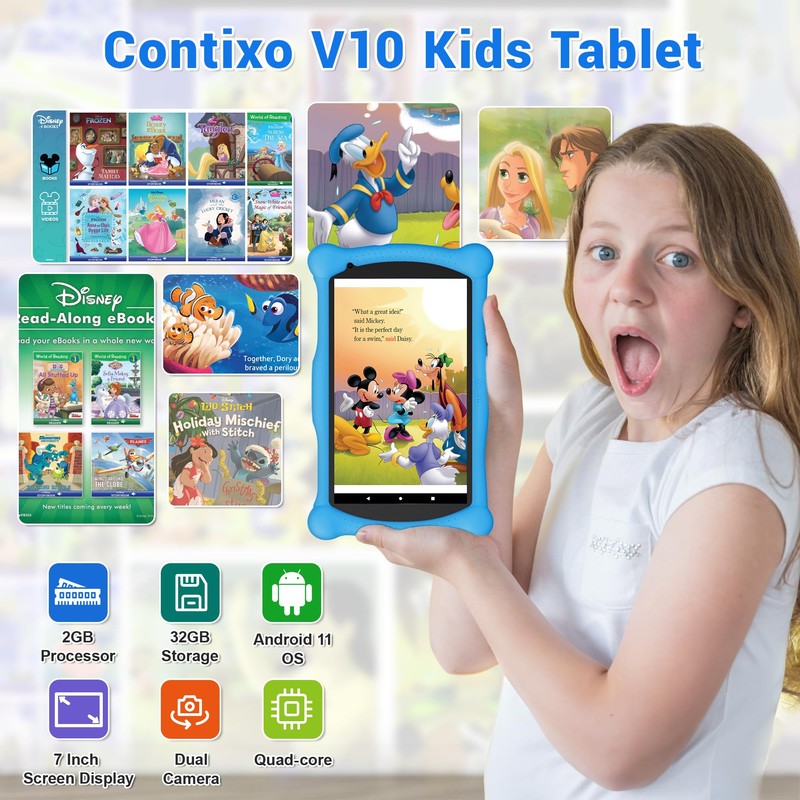 - Easy Parental Control & Full Access to Google - Kids Place allows you to control screen time and kid friendly contents. Filter feature can ensure your kids see filtered websites, apps, video channels etc. This app has no ads and no in-app purchases without your permission. Contixo V10 is also a fully functional Android Tablet. With GMS Certified, you have full access to the latest Google Service such as Gmail, YouTube, Disney + and many more apps and contents.