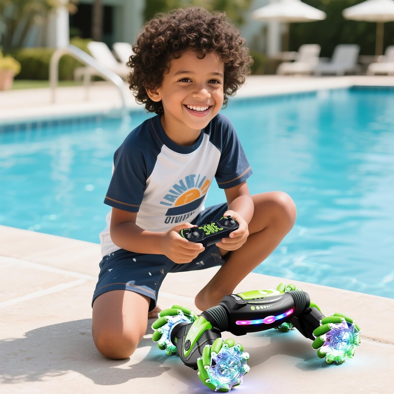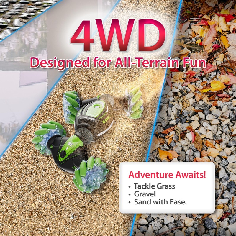 Unleash high-speed fun and hands-free excitement with the Contixo SC1A RC Car—an advanced 4WD stunt vehicle packed with smart control, all-terrain durability, and epic flipping performance. The included gesture-sensing controller lets drivers steer, spin, and flip with a simple hand motion, while the classic remote gives full-button control for traditional races. With the SC1A Remote Car, every ride can be customized to match your play style. Engineered for power and action, the SC1A Stunt Car drives on both sides and performs wild 360° spins and side drifts with ease. Whether indoors or outdoors, its rugged wheels and full four-wheel drive take on grass, gravel, or pavement without slowing down. Built-in color-changing LED lights add a vibrant, electric effect to every move, creating an exciting light show while you drive. Whether you're a kid exploring RC fun or an adult who loves creative tech, the Contixo SC1A Remote Control Cars deliver unforgettable performance, intuitive control, and all-day action.
