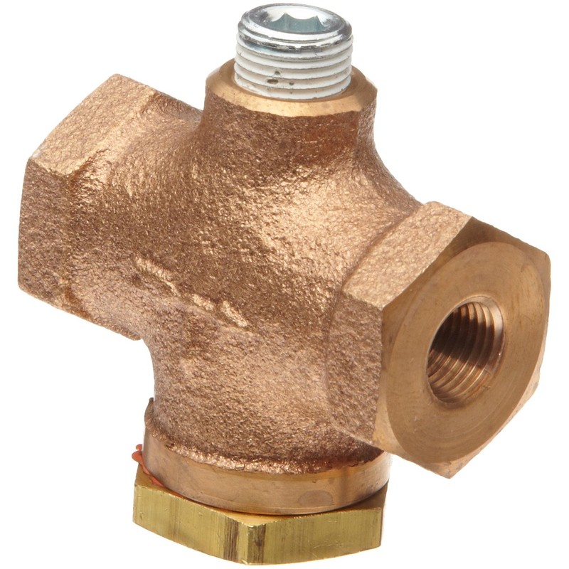 This Control Devices check valve is designed for installation into air compressor discharge lines. The valve body is made of cast brass for corrosion resistance, ductility at high temperatures, and low magnetic permeability. This valve has a glass-filled polytetrafluoroethylene (PTFE) poppet with eight discharge holes for quiet operation, and stainless steel spring. It has female NPT threads for connecting to male threaded pipes, creating a tighter seal than straight threads. The maximum pressure rating is 250 pounds per square inch (psi), and the maximum working temperature is 450 degrees Fahrenheit.