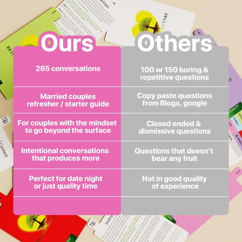 - Deeper Connection Through Engaging Questions: Uncover new layers of intimacy with thoughtfully crafted questions that prompt meaningful conversations. These cards are designed to spark dialogue between you and your spouse, fostering a deeper connection by exploring various aspects of your relationship.