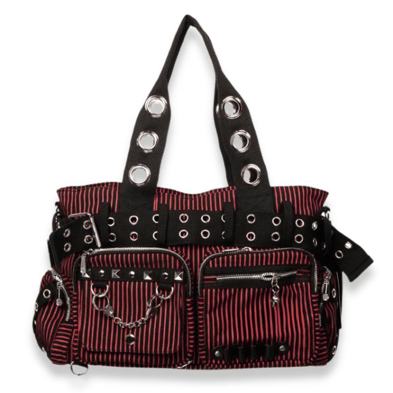 These multi pocketed belt shoulder bags are a punk-rock dream come true. Complete with adjustable crossbody strap, grommet shoulder straps, handcuff charms, and metal skull zipper charms. Strike a devil-may-care attitude whether you're heading out for class or a night on the town!