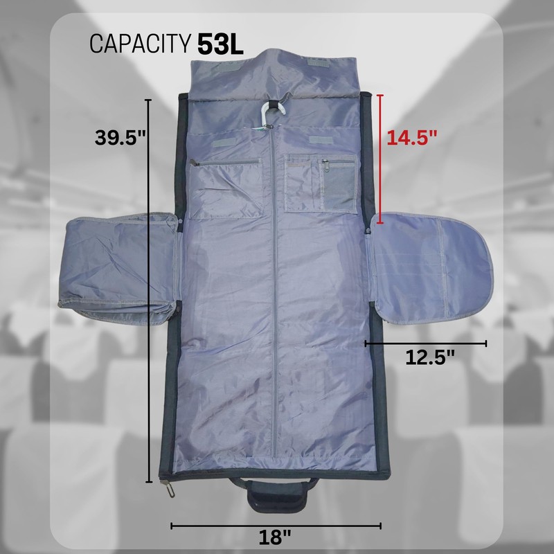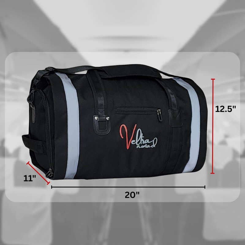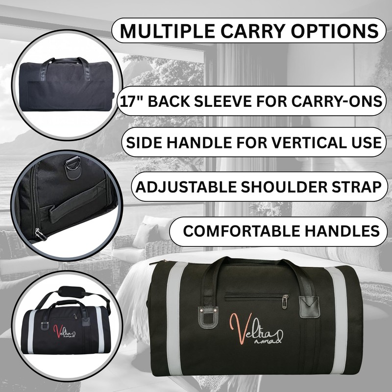 The Veltra Nomad garment bag for travel is not just a carry on luggage with suit compartment, isyour perfect trip companion anywhere you go. It is made to fit most airplanesoverhead storage bin, under seat, automobiles back seat. When not in use youcan fold it and fit it anywhere. The drawstring pouch that comes with this convertiblegarment duffel bag can also be used as a laundry holder.