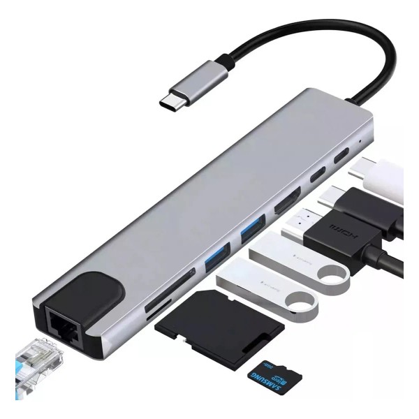 Descripción Limpia: Concentrador USB tipo C 8 en 1: el adaptador multipuerto USB C 8 en 1 cuenta con puerto de carga PD, puerto HDMI, ranura para tarjeta SD/TF, puerto Ethernet, 2 puertos USB, 1 USB/C.