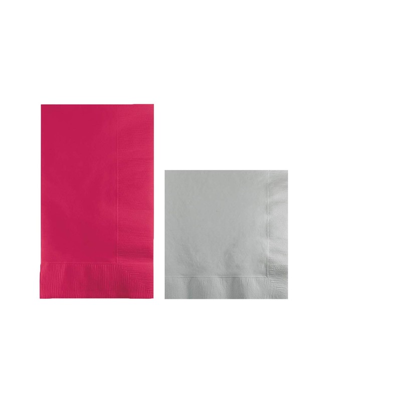 Converting Paper Bulk Party Napkin Bundle, 100 Magenta Dinner and 200 Silver Beverage/Cocktail Paper Napkins, Box of 300 Napkins