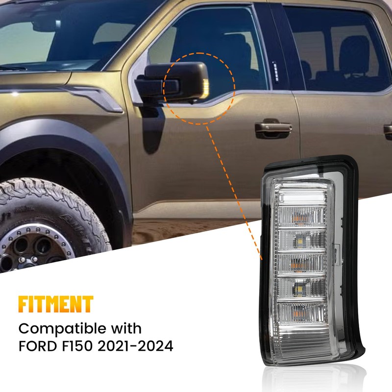 - Perfect Fit for Ford F150 2021–2024: Designed to be a direct replacement for OEM mirror turn signal lights, this LED light set is precisely engineered to fit Ford F150 models from 2021 to 2024. No modifications required — just plug and play for seamless integration