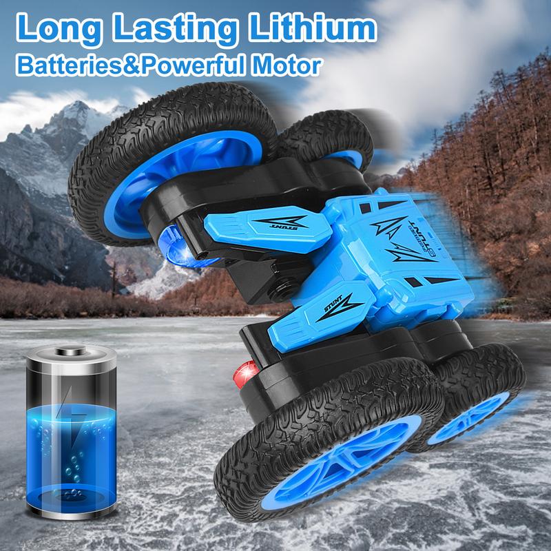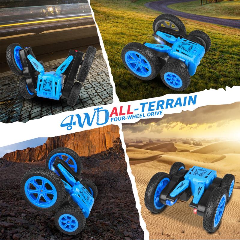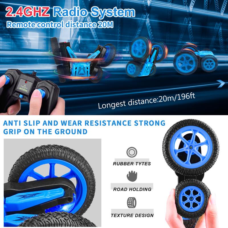 Shockproof and Off-Road:the anti-crash stunt RC car is durable and lightweight. Strong grip for climbing up to 45°. Durable wheels and well-constructed anti-slip tyres ensure high speed and stable performance on grassland, sand, gravel, snow and concrete road.