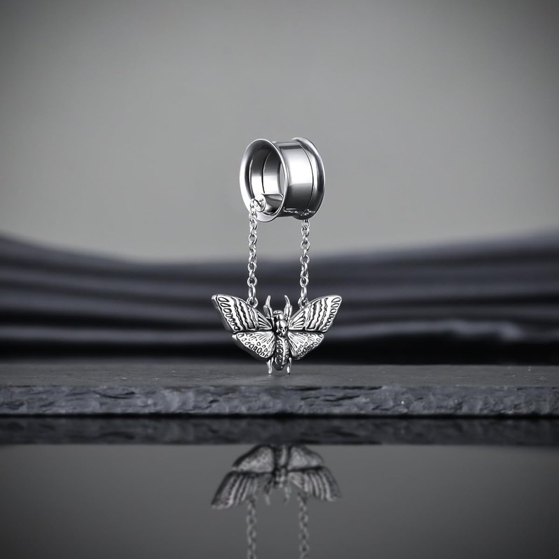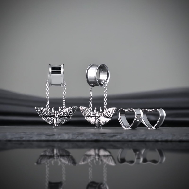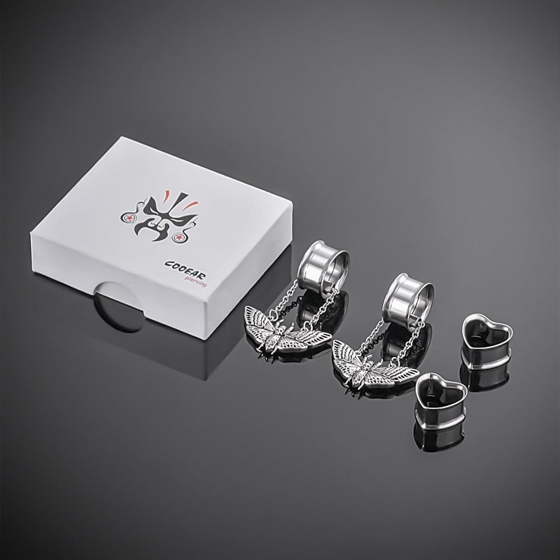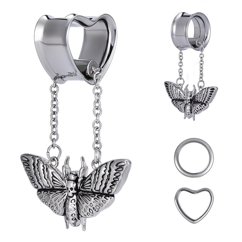 COOEAR Heart Gauges For Ears, Heart Tunnels Double Flared Plugs, Butterfly Dangle Plugs Earrings 5/8".