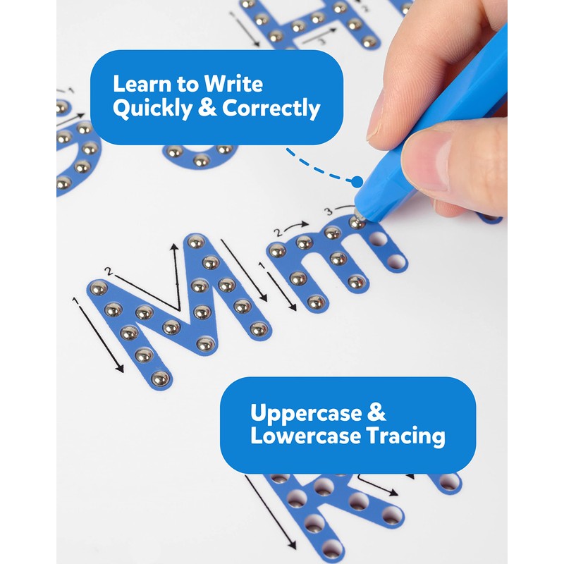 - Mesmerizing Writing Toy: The magic writing board with lead-free ABS material made a safer toy for kids. A forceful enough but not super magnetic stylus is appropriate to attract those metal balls to pop up while adding a smooth tactility for letter-tracing. Teaches capital letters, lowercase letters, letter strokes, and much more!