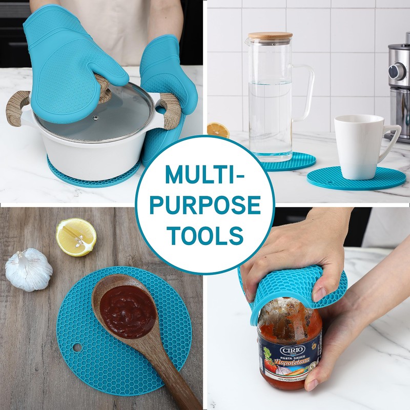 - Complete 6-Piece Kitchen Mitt Set: Our COOK WITH COLOR Silicone Oven Mitt Set is an all-inclusive collection, featuring 2 oven mitt pot holders, 2 silicone trivets, and 2 fingertip mitts for cooking and BBQ. Each piece boasts a heat-resistant design and soft quilted lining for unmatched comfort and flexibility, making it the ideal addition to your kitchen arsenal.