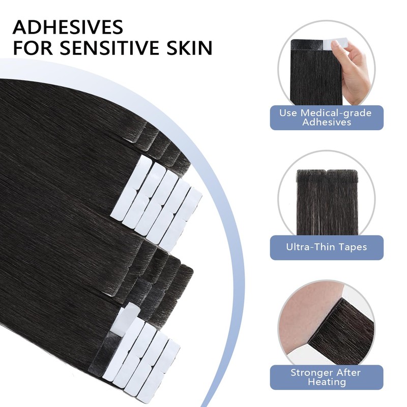 - Premium Quality Tape Ins: tape in hair extensions are made of high-strength invisible tape. Hypoallergenic, docile and waterproof. Double-sided tape will be stronger after moderate heating.