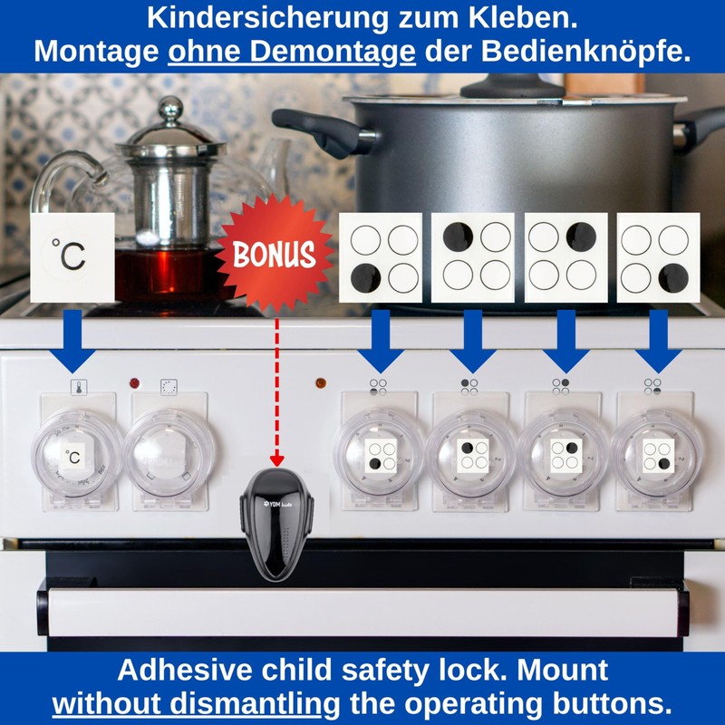 - Box contents: 6 x stove protection fuses, heat-resistant plastic, transparent adhesive, including 5 x control elements stickers, 1 x oven child lock, in black.