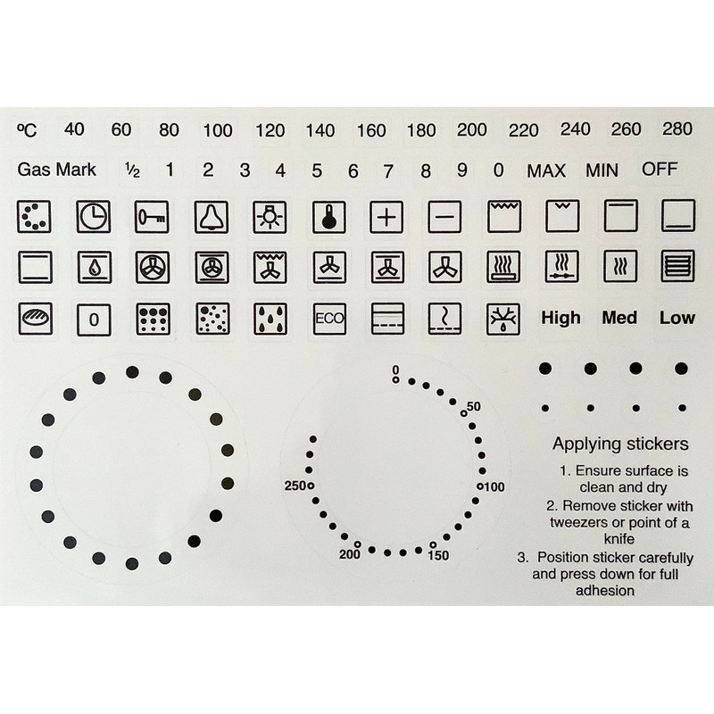 Pre-cut self adhesive stickers to replace worn markings on ovens. The stickers have black print on a transparent PVC background, simply remove from the backing sheet and apply. They are intended to improve the usefulness and appearance of damaged appliances. These stickers are 'universal' and do not correspond exactly to any specific oven. Please check the dimensions are suitable before purchasing (inner diameter of rings 46 mm, outer diameter 68mm) Stickers include 33 common function symbols, gas mark and degrees centigrade numerals and two temperature selector rings. One ring is pre-printed with temperatures in deg C. The other ring is blank for custom temperature numerals to be applied.