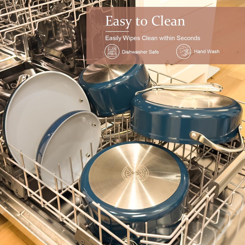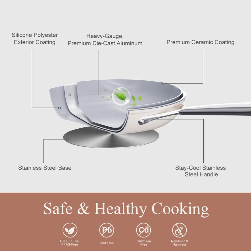 - NATURAL CERAMIC COATING - Featuring a next-generation nonstick surface, this cookware set is free from Teflon, PFAS, PTFE, PFOA, lead, cadmium and other toxic materialss, promoting healthier cooking with less oil and effortless food release. The advanced coating is 50% smoother, safer, more durable, and maintains exceptional performance after 500,000 Taber Test cycles in wet conditions and 20,000 cycles in dry conditions.