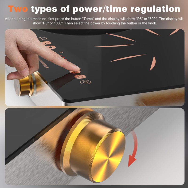 - đĄăDual Control Methods & Stepless Adjustment ăChoose between touch control and knob control for seamless power adjustments, ranging from 400â~1200â(P0~P9). Cooksir countertop 2 burner electric cooktop allows you to have precise control over your cooking, from summering to frying, ensuring perfect results every time. Suitable for elders and people with poor eyesight.