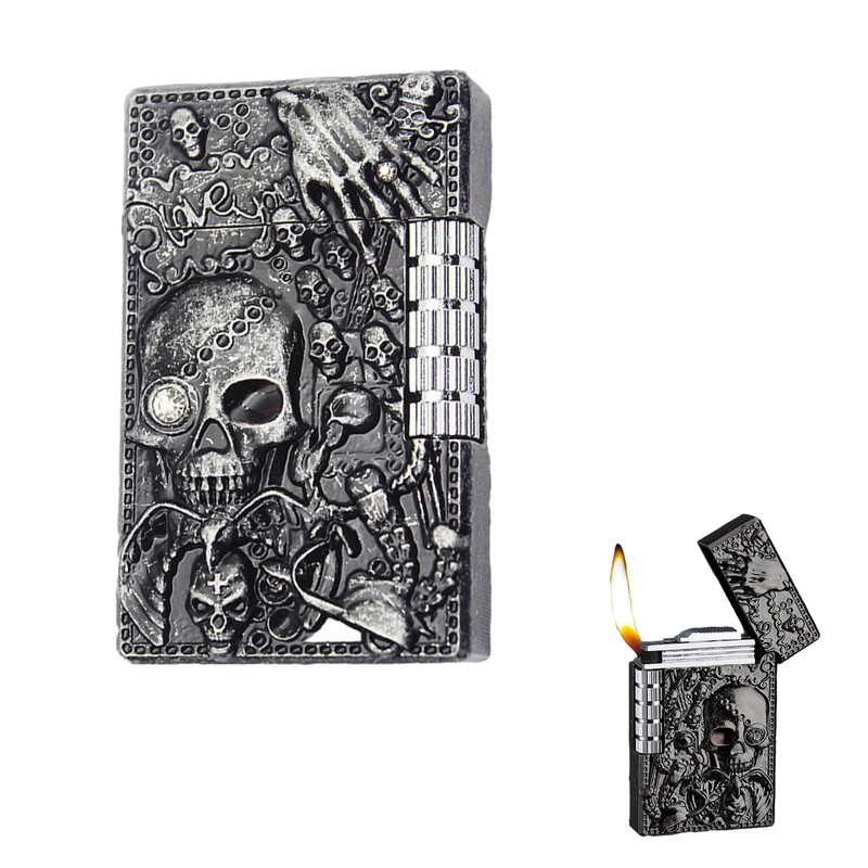 - [HIGH QUALITY MATERIAL] This cool lighter is made of high quality zinc alloy, and its skeleton body design is the root of all evil. Exquisite workmanship and round shape. Compact and easy to carry in your pocket, this skull lighter is the perfect piece of equipment for your outdoor adventures, as well as for decoration or collection.