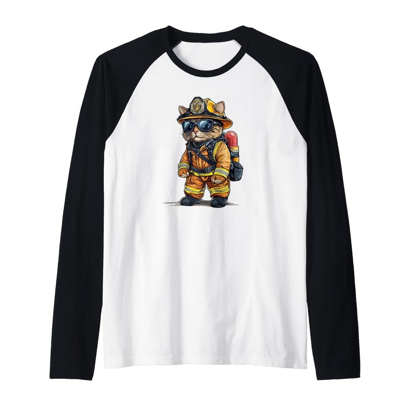 Cool Fire Brigade Cat Costume for Firefighter Raglan Baseball Tee