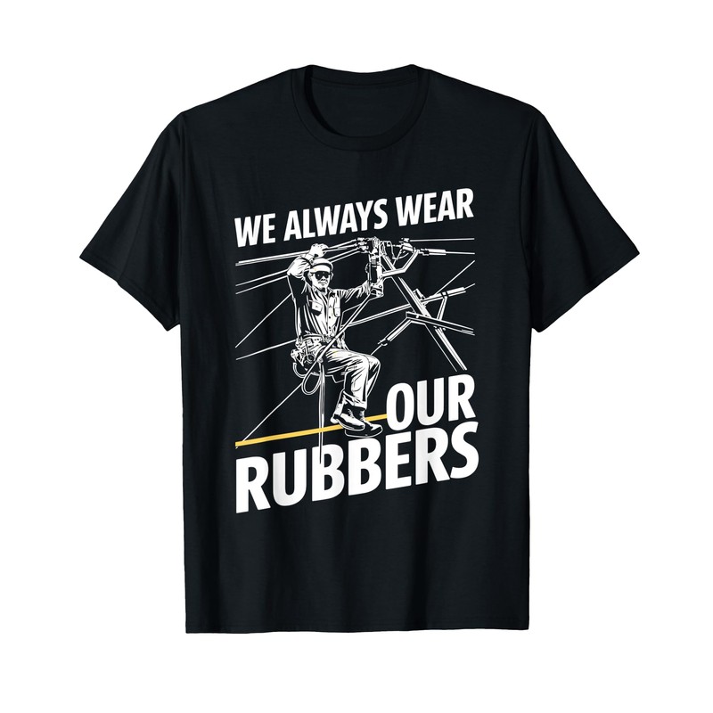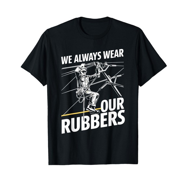 • Electrician men and women design with a hilarious lineman saying: We Always Wear Our Rubbers.