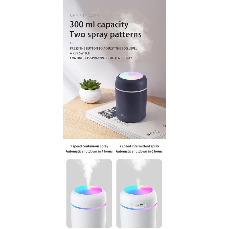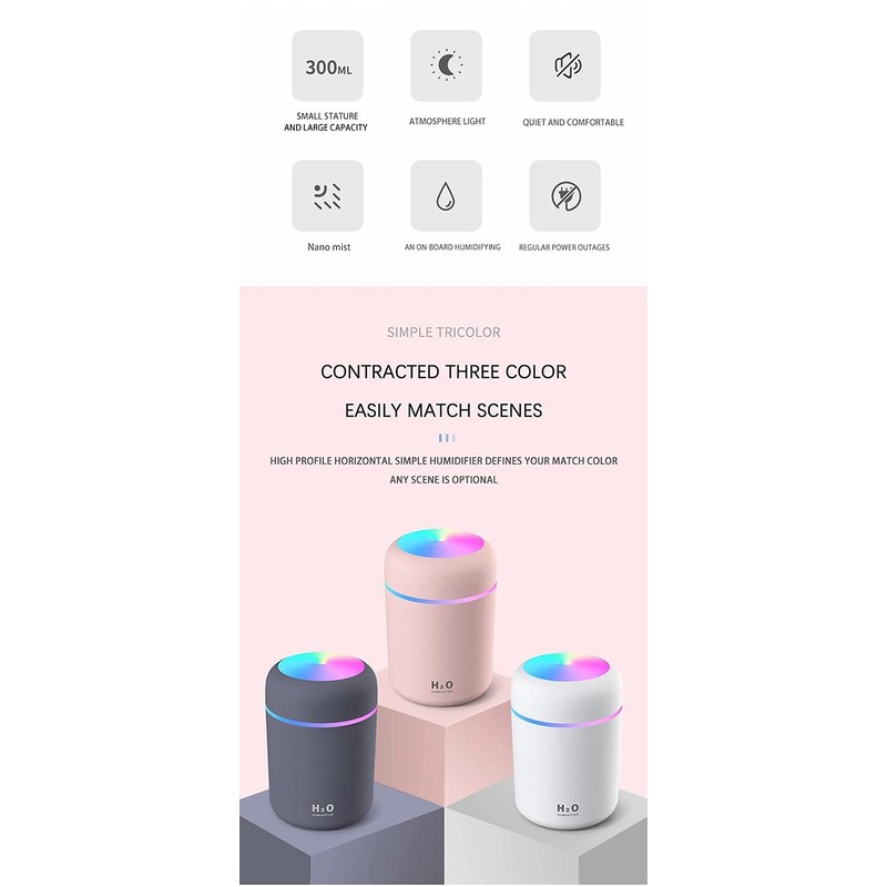 - Application Car, RV, Outdoor, Hotel, Garage, Commercial, Household Power Source USB, Vehicle Power Supply Type Cool-Mist Impeller Humidifier Installation Portable Certification CE, RoHS Power (W) 2 Voltage (V) 5 Place of Origin Shenzhen, CN Capacity 300ML Humidity Control Humidistat Material ABS + Silicon + PP Feature Fresh Air Working time 6 Hours Noise 15db Volume of spray 45mLh Function Humidification + Aromatherapy LED light Color Changing
