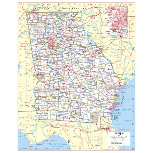 Cool Owl Maps Georgia State Wall Map Poster Rolled 24"Wx30"H (paper)