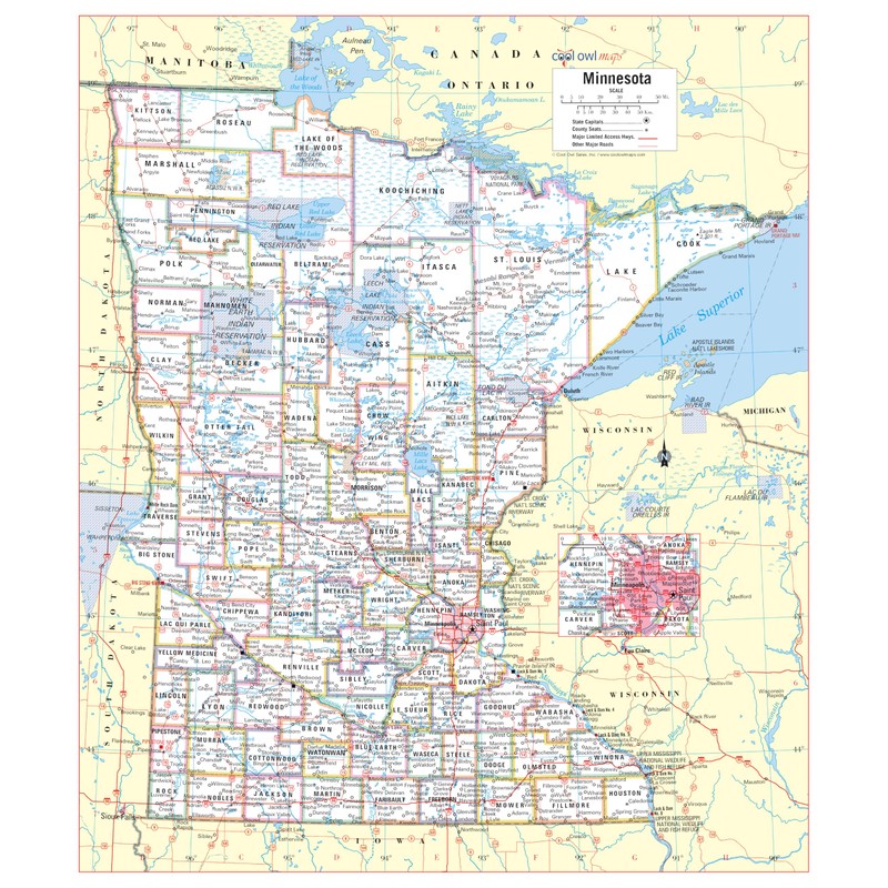 Cool Owl Maps Minnesota State Wall Map Poster Rolled 24"Wx28"H (Laminated)
