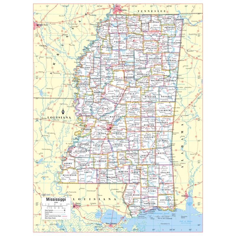 Cool Owl Maps Mississippi State Wall Map Poster Large Print Rolled 24"Wx32"H (Paper)