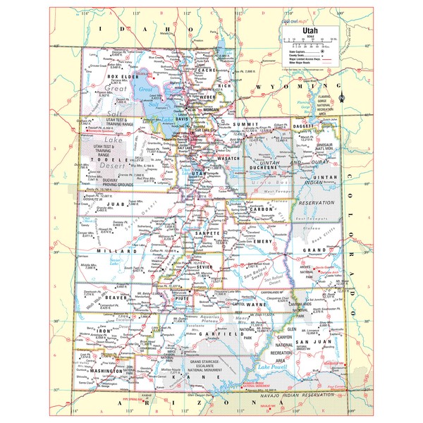 Cool Owl Maps Utah State Wall Map Poster Rolled 24"Wx30"H (Laminated)