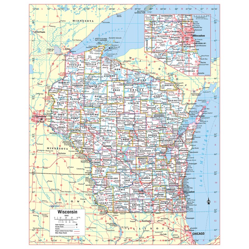 Cool Owl Maps Wisconsin State Wall Map Large Print Poster 24" Wx30 H - rolled Laminated