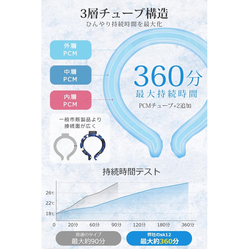 - (Innovative 3-layer tube construction x 360 minutes of long lasting cooling experience) Introducing a neck cooler to keep you cool this summer. Neck Cooling Goods: The innovative 3-layer tube construction and PCM material are boldly increased by 70% to achieve an overwhelming cooling performance. An internal cooling layer instantly adjusts body temperature and provides a comfortable cool-down experience. The outer material layer prevents condensation and maintains a comfortable feel for long periods of time. Long lasting cooling sensation for up to 360 minutes is far better than conventional cooling towels and cooling products. The neck cooler will keep you cool and comfortable even in the blazing sun or harsh environments of high temperature and humidity. Go through this summer comfort! Never suffer from the heat again with the ultimate cool performance and long lasting cool neck ring