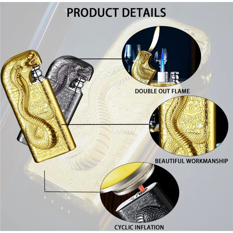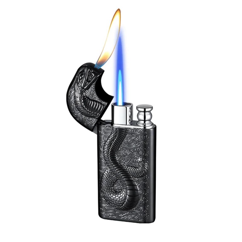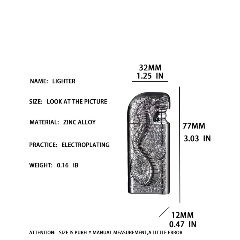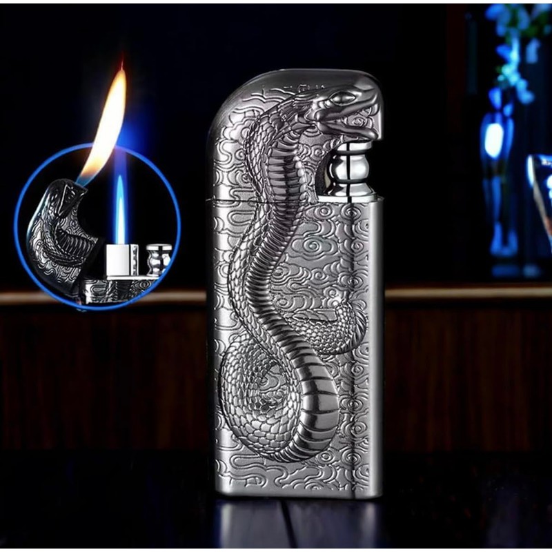 - Aesthetic: This cool animal shaped lighter is made of high quality zinc alloy, and its snake body design. Exquisite workmanship and round shape. Compact and easy to carry in your pocket, this lighter is the perfect piece of equipment for your outdoor adventures, as well as for decoration or collection. Serpent design.