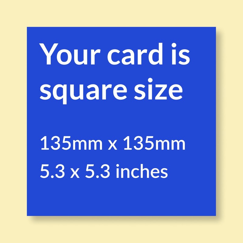 - Our greetings cards measure 135 x 135mm and are printed on super high quality paper made from sustainable forests. Each card comes with a sturdy brown envelope and is perfectly sealed in a polybag to protect the lovely design