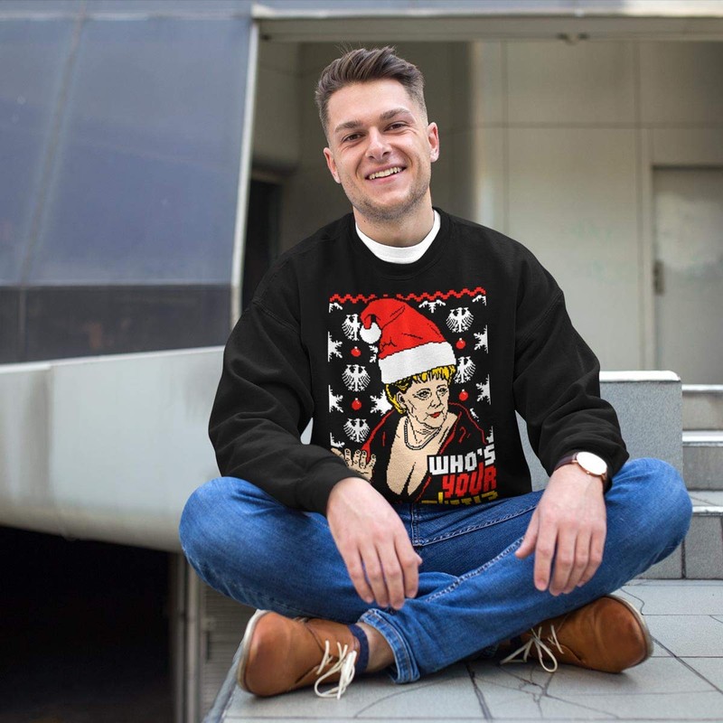 Cool ugly Christmas jumper with Angie - “Who's Your Mutti?” Sweatshirt. Printed with market-leading technology to guarantee top quality. The print has been hardened using heat treatment methods for long-lasting durability of the print.