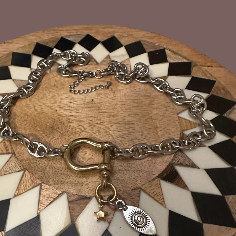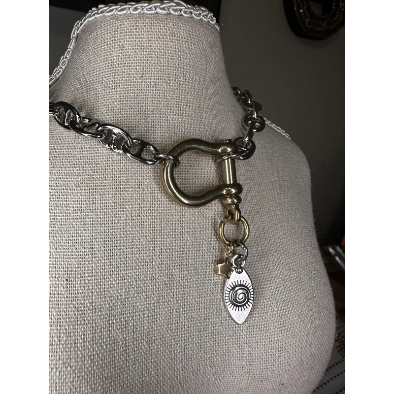 Designed and made by me..Chunky, heavy, silver brass mariner chain with a cool light gold brass carabiner/shackle charm holder clasp which is functional-add/remove charms easily. She gives attitude!