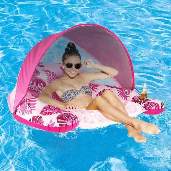 COOLCOOLDEE Pool Float with Canopy, Cup Holder - XL Pool Chair Lounge Float with Adjustable Sun Shade Cover, Drink Holder, Ergonomic Headrest,Inflatable Pool Float for Adults